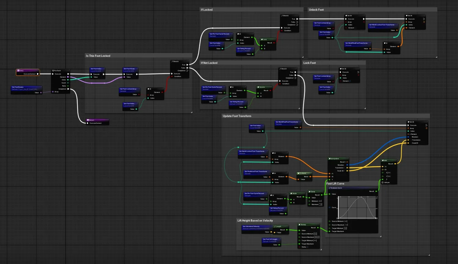 Determines if feet are locked or not, then lerps between previous foot location and the predicted one, while also raising and lowering the foot