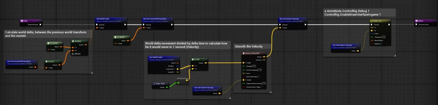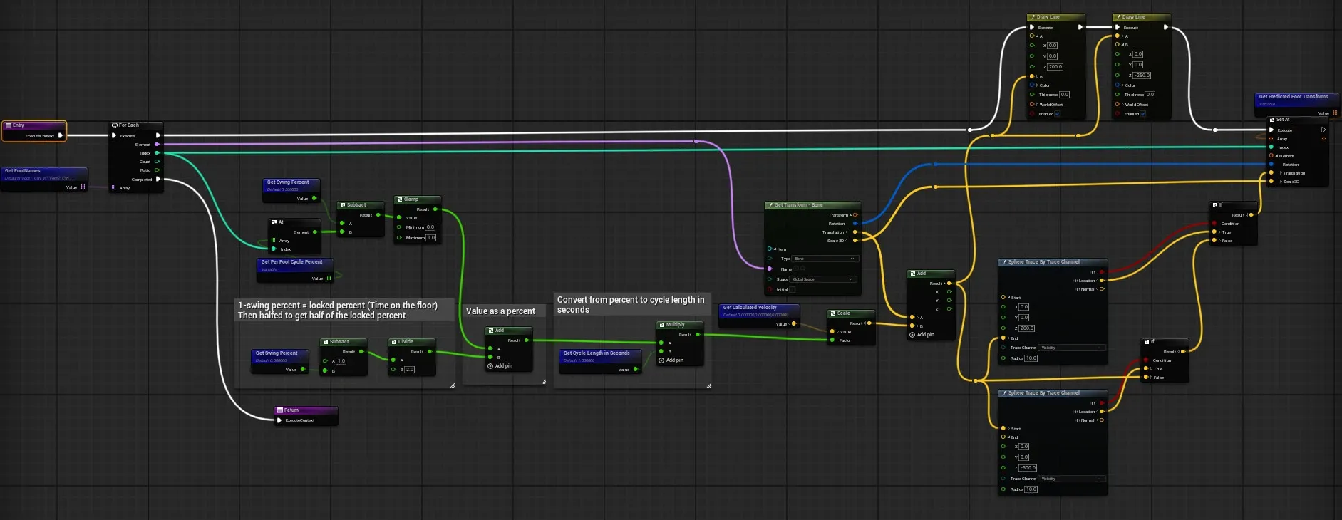 Draws the line trace shown in the first image and adds calculated velocity to determine new location for foot